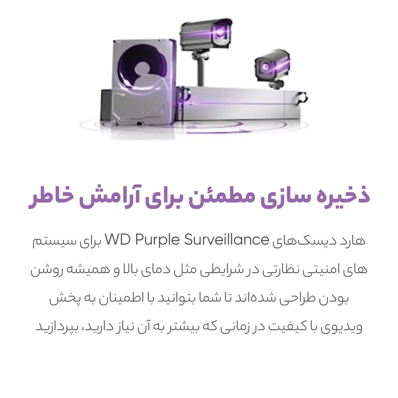 کمپانی وسترن دیجیتال در سال 1970 میلادی تأسیس و در زمینه محصولات شبکه و درایوهای ذخیرهسازی شروع به کار کرد. این کمپانی که در زمینه تولید هارد دیسک یکی از پیشگامان و خلاقان این صنعت است، هارد دیسکهای داخلی خود را در رنگبندیهای گوناگون و برای مصارف مختلف و متنوع طراحی و تولید میکند. در نمایشگاه IFSCE 2014 لندن این کمپانی سری جدید هارد دیسکهای خود را با رنگ بنفش و کاربرد نظارتی معرفی کرد. هارد دیسکهای سری بنفش وسترن دیجیتال برای ذخیرهسازی تصاویر دوربین و مطابق با استانداردهای نظارت تصویری طراحی و تولید شدهاند. این سری از هارد دیسکها پایداری بسیار خوبی دارند و عمر بسیار بالایی نسبت به هارد دیسک داخلی معمولی دارند. یکی از تکنولوژیهای به کار رفته در این سری از هارد دیسکها AllFrame نام دارد که باعث میشود میزان فریمهای از دست رفته در هنگام ضبط تصاویر، به صفر برسد، بنابراین شما دیگر هیچ فریمی را از دست نخواهید داد. از دیگر تکنولوژیهای به کار رفته در این هارد دیسک میتوان به Intelliseek اشاره کرد که برای ارائه تعادل میان عملکرد و قدرت در هارد دیسک به کار میرود و باعث کاهش لرزش، صدا و مصرف برق هارد دیسک میشود. این هارد دیسک به رابط SATA III با سرعت انتقال اطلاعات 6 گیگابایت بر ثانیه مجهز شده است و سرعت گردش آن 5400 دور در دقیقه است، همچنین قابلیت ثبت همزمان تصاویر گرفته شده توسط 32 دوربین مختلف را دارد که قابلیت بسیار مهمی در استفادههای نظارتی محسوب میشود. این هارد دیسک در ظرفیتهای مختلفی تولید شده و انتخاب مناسبی برای استفاده در دستگاههای ضبط تصاویر دیجیتال یا همان دستگاههای DVR است.